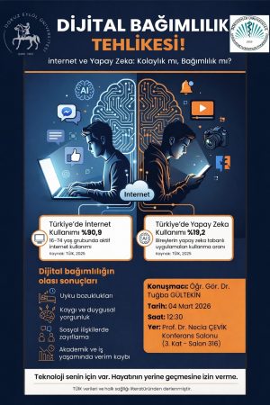 Bağımlılıkla Mücadele Komisyonu tarafından düzenlenen Yapay Zeka Bağımlılığı başlıklı seminerimiz Öğr.Gör.Dr. Tuğba Gültekin tarafından verildi. Yayınlanma Tarihi: 06-03-2026